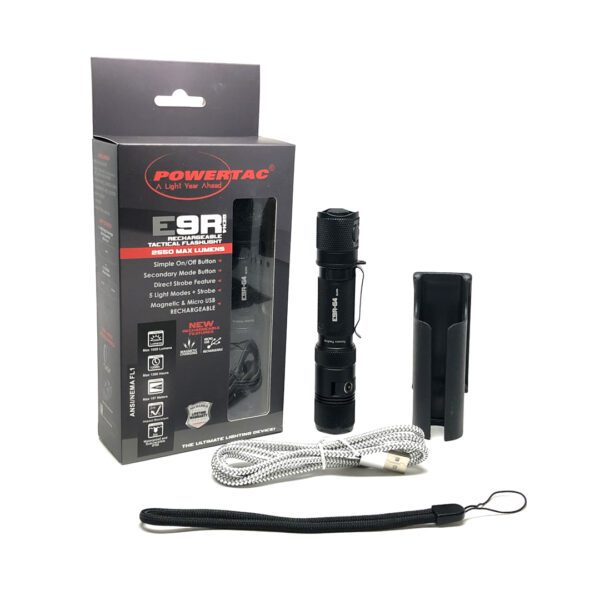 The Powertac E9RG4 is perhaps the best all-around “duty” light on the market today. It features a one-handed operation to control four brightness levels and has a direct to strobe function. The 2500 lumen output is blinding and the beam is wide enough for superior situational awareness. E9RG4 is a magnetic cable USB rechargeable for convenience. Small size, superior performance, and long runtime make the E9RG4 a favorite of police officers.