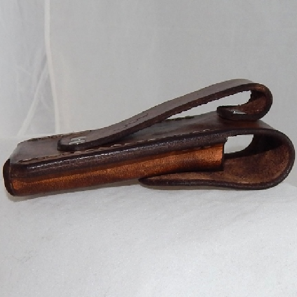 The approximately 5 oz leather is wet-formed to shape. Although wet-forming requires additional days for drying time, it makes the leather much firmer. This makes the pouch strong and durable without added weight. It was stitched with heavy duty bonded nylon thread, stained, and given a protective finish all by hand. It features a heavy duty line 24 snap closure. The leather belt loop option will accommodate up to 2″ wide belt and can be secured with double capped rivets or hand stitching. Or, you can opt for a metal spring clip instead of a leather belt loop. The sheath itself is approximately 5″x2″x1″ in overall outside dimensions. It will accommodate a pocket knife or similar item up to a maximum size of 4 3/8″ x 1″ x 1/2″. We carry our Case trapper style pocket knives in sheaths this size. Other size pouches can be made for custom orders.