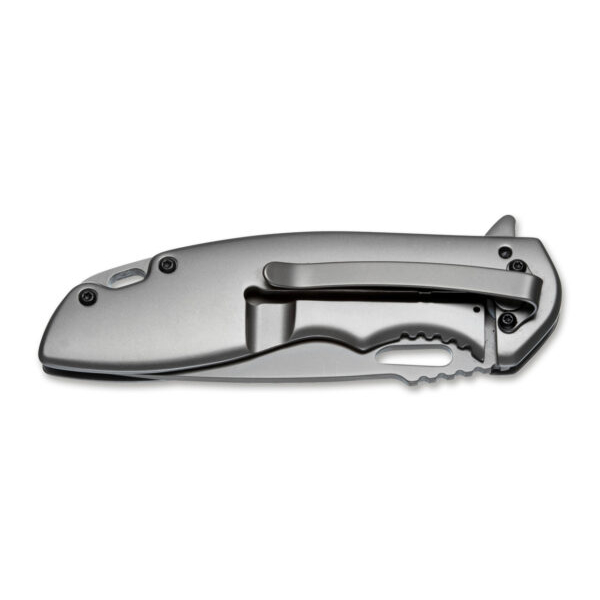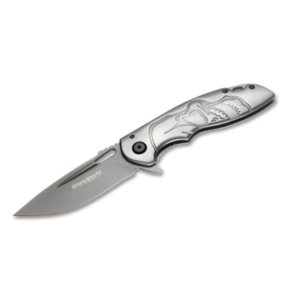 The metal handle of the Magnum Massive Half Skull sports a deep relief-embossed half skull. It has an impressive heft and secure grip. The drop-point blade of stainless 440A steel can be easily opened with the thumb opening or flipper. A sturdy framelock secures the blade. The screw-mounted lanyard hole and the clip (tip-down) offer a variety of options to carry the knife.