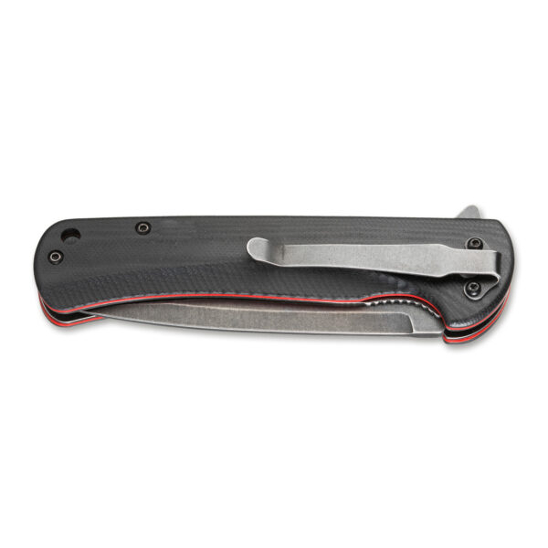 The Magnum Mobius is a full-size tactical folder with an elegant look that is unusual for this knife class. The surface of the G10 handle scales has a subtle but effective texture. Two dark red fiber layers between the steel plates and the black scales add visual appeal. The linerlock is integrated into the handle, unobtrusive but easy to operate. The 440A stainless steel blade has a flipper and an acid-wash finish. With a sturdy generously sized clip.
