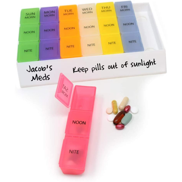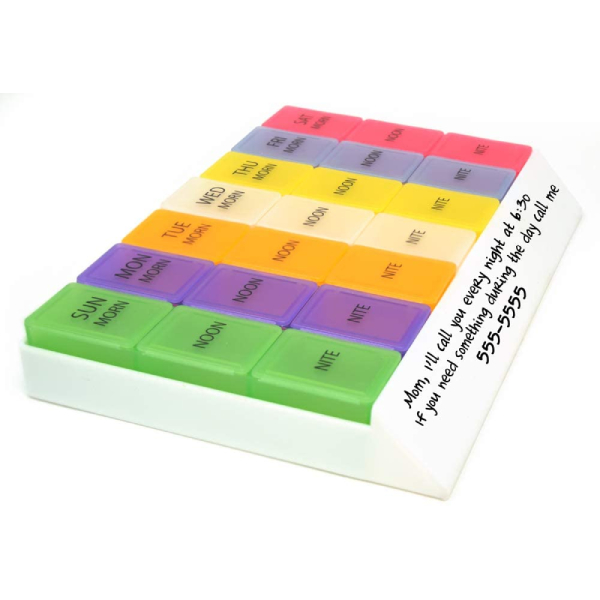 - PILL ORGANIZATION WITH A WRITABLE SURFACE – Use the slanted front area of the pill organizer tray to indicate whose pills they are, notes or instructions about the medications, a reminder to take additional non-pill medications, or just a fun note to a loved one – right where they can see it.