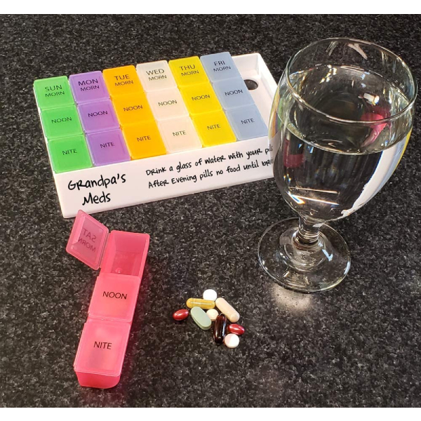 It is also a great place to write a reminder to take additional medications that can not be kept in the pill organizer such as ointments, sprays, drops, etc. When several people in your household are taking medications it is also an easy way to identify whose pills are whose.