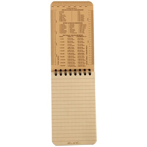 Trusted around the world, Rite in the Rain tactical notebooks are the ones you want in the field! The 3″ x 5″ notebook has a tough Polydura cover and non-glare tan all-weather paper that protects your data in any condition. 100 pages of the Universal pattern means plenty of room for notes and scaled drawings. Handy reference material of rulers, map scales, and measurement conversions are printed on the back and inside covers.